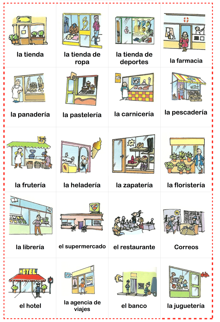 Aquí encontrarás el vocabulario de los servicios que encontramos en las ciudades y también el de las tiendas y comercios. Lee el vocabulario y ve los vídeos antes de hacer las actividades interactivas 🙂