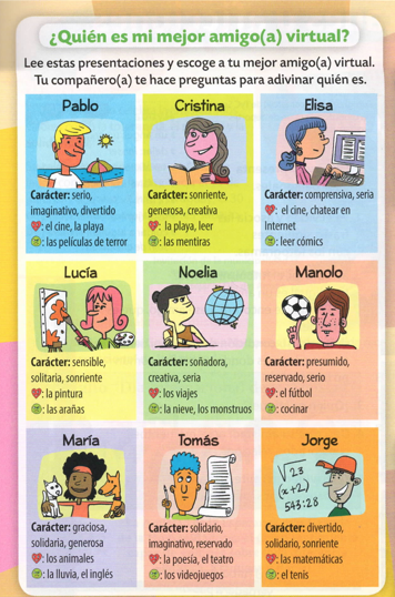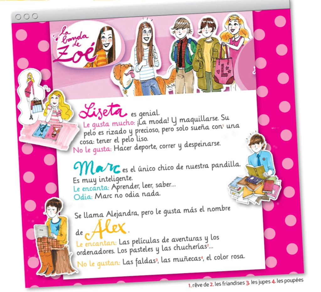 En esta secuencia estudiarás el vocabulario del carácter, los verbos para expresar gustos y sentimientos, los comparativos. Al final de la secuencia podrás hablar de tus amigos, definir cómo son, compararlos, decir lo que les gusta y lo que odian. También descubrirás a los amigos de Zoe y de Mafalda.