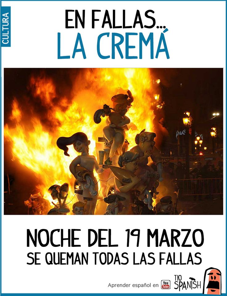 Las Fallas se celebran entre el 15 y el 19 de marzo; cada año se plantan en la ciudad de Valencia, cientos de fallas grandes y pequeñas, que son objeto de admiración por parte de valencianos y visitantes hasta el 19 de marzo, -día de la cremà-, en el que estos grandiosos monumentos de cartón piedra desaparecen consumidos por las llamas.