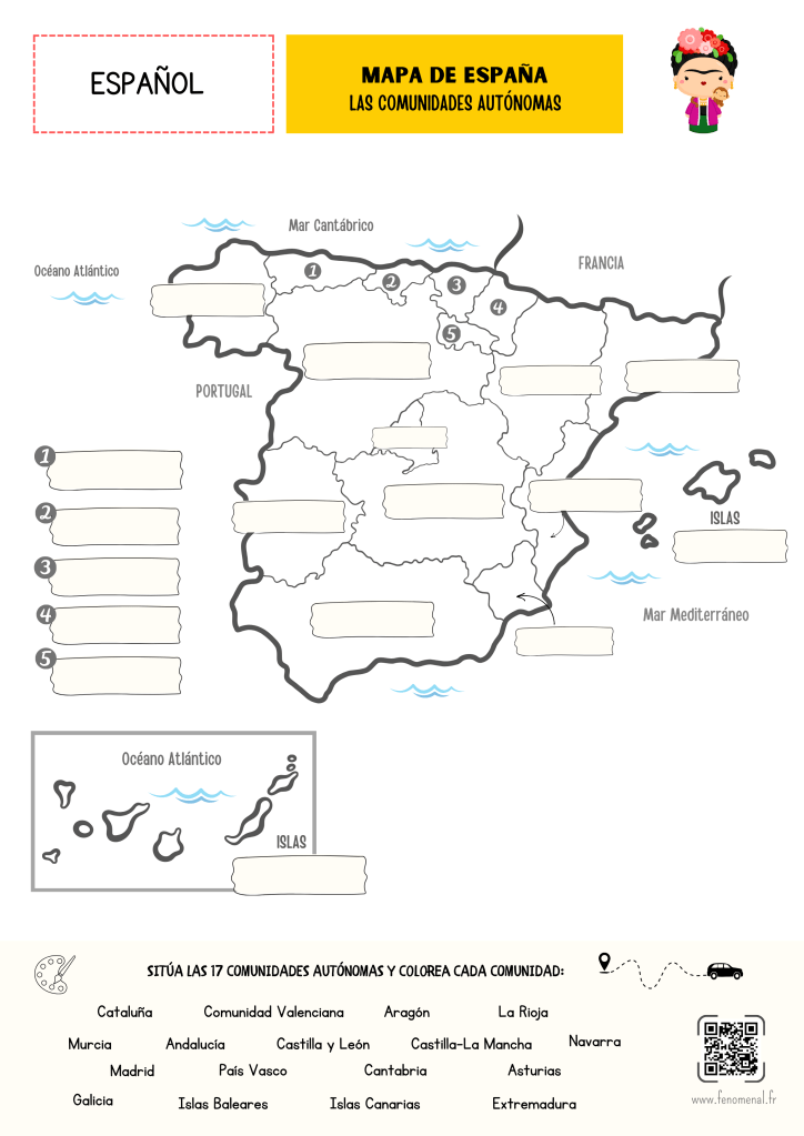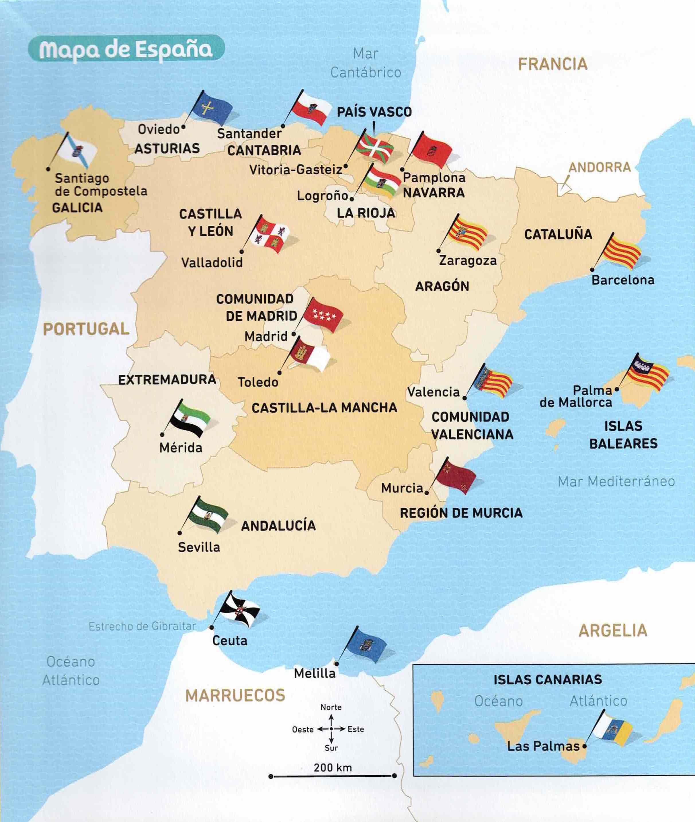 España se compone de 17 autonomías (o comunidades autónomas) y de 2 ciudades autónomas: Ceuta y Melilla. Está situada en la península ibérica y está rodeada por el mar mediterráneo, el océano atlántico y el mar cantábrico.