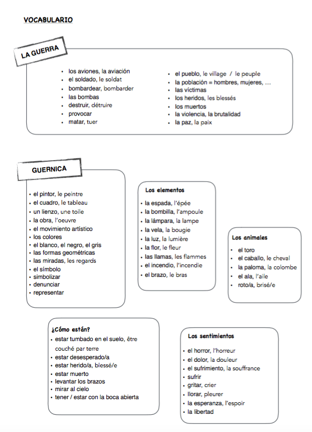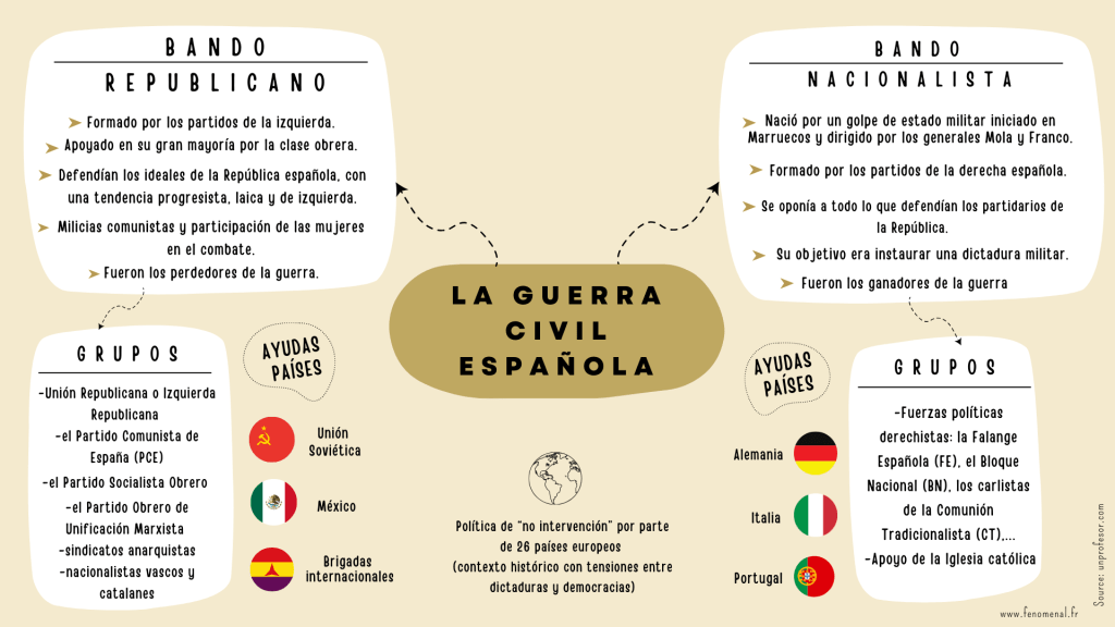 La guerra civil tuvo lugar en España de 1936 a 1939. Estalló el 18 de abril de 1936. España se dividió en dos bandos: los nacionales o nacionalistas (derechas) y los republicanos (izquierdas). Terminó con la victoria de los nacionales encabezados por el general Franco.