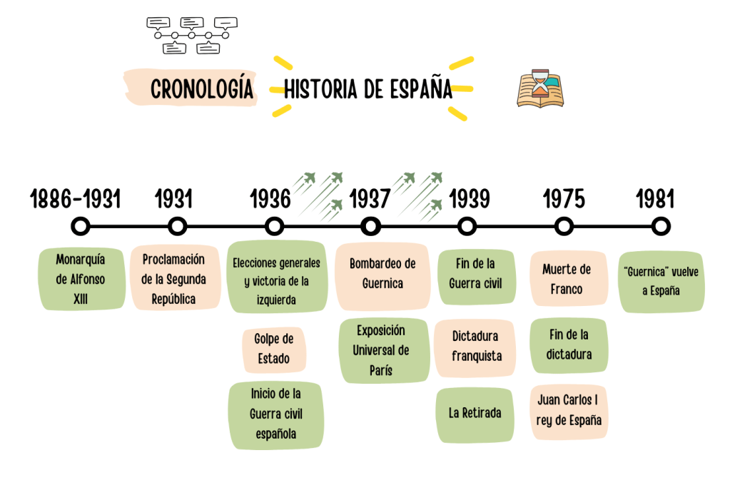 Puedes navegar por la página para aprender más sobre este periodo: la batalla del Ebro, el bombardeo de la ciudad de Guernica y las consecuencias de la guerra como el exilio de miles de republicanos a Francia.
