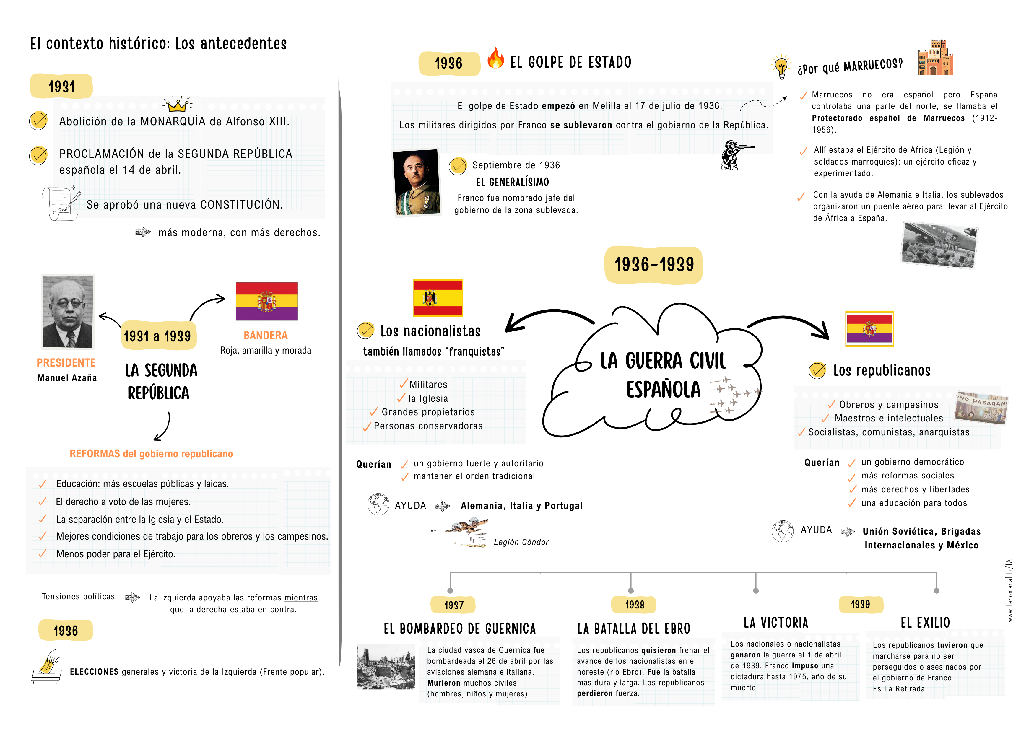 La guerra civil tuvo lugar en España de 1936 a 1939. Estalló el 18 de abril de 1936. España se dividió en dos bandos: los nacionales o nacionalistas (derechas) y los republicanos (izquierdas). Terminó con la victoria de los nacionales encabezados por el general Franco.