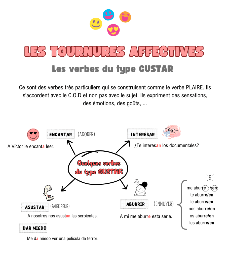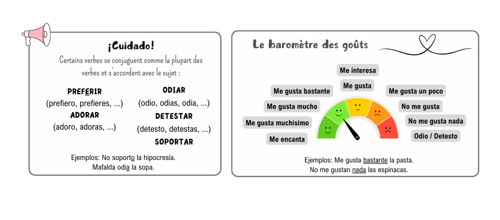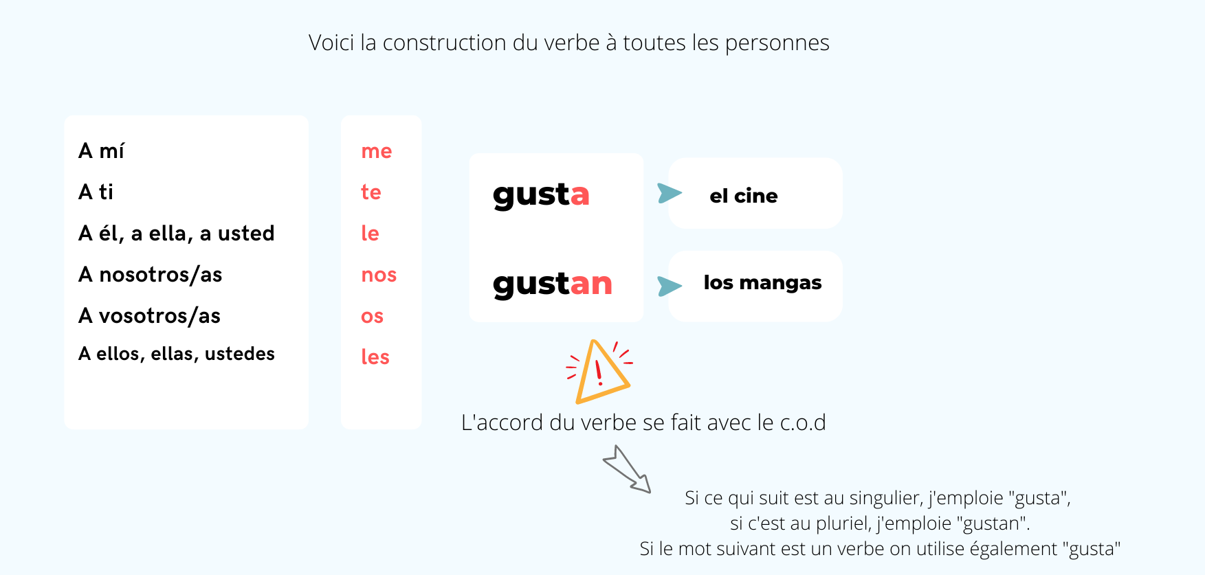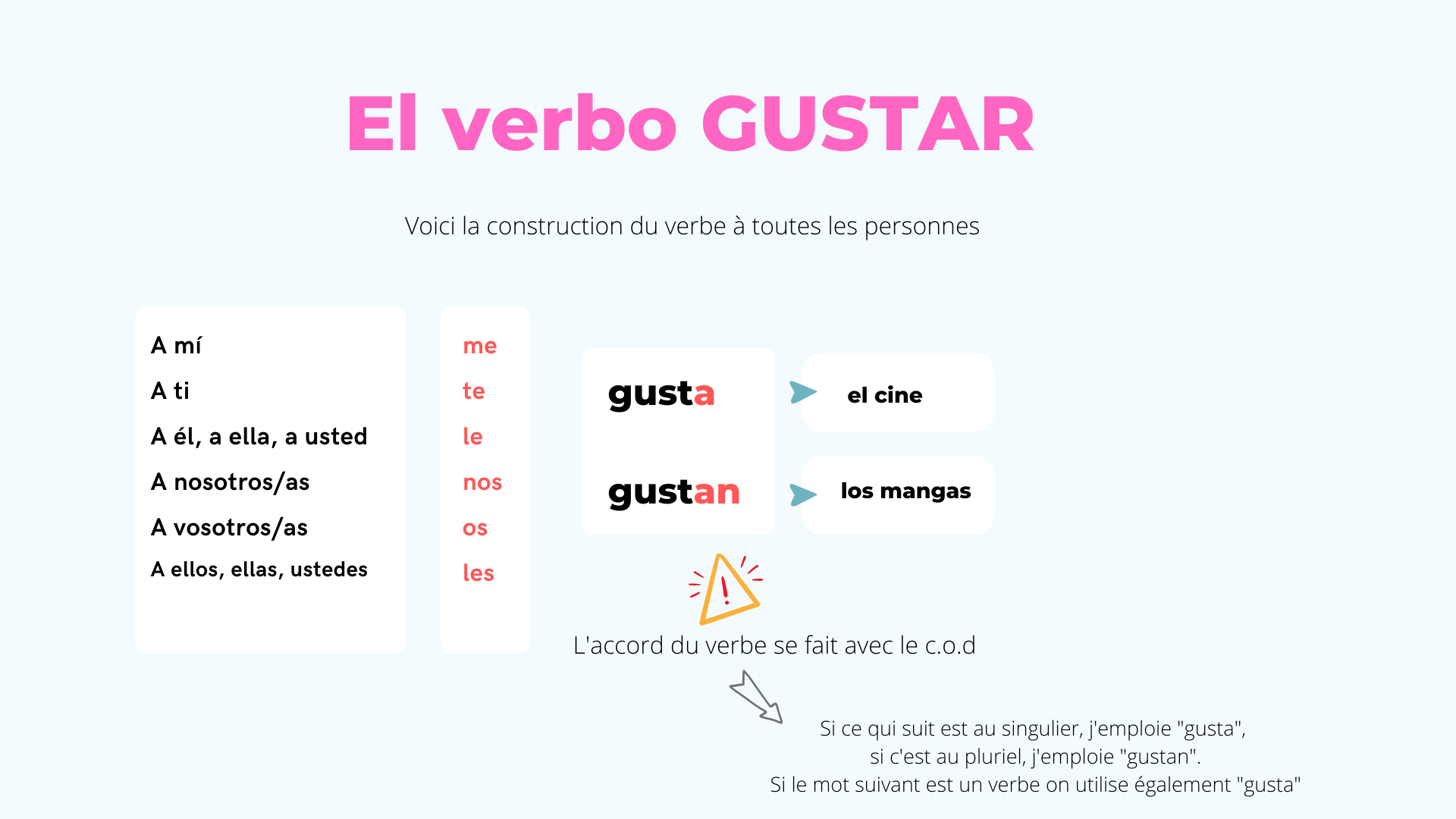Le verbe GUSTAR est employé pour dire ce que l’on aime ou pas. Comme tu le sais, c’est un verbe très particulier qui se construit comme le verbe PLAIRE. Il s’accorde avec ce que tu aimes (le C.O.D) et non pas avec le sujet.
