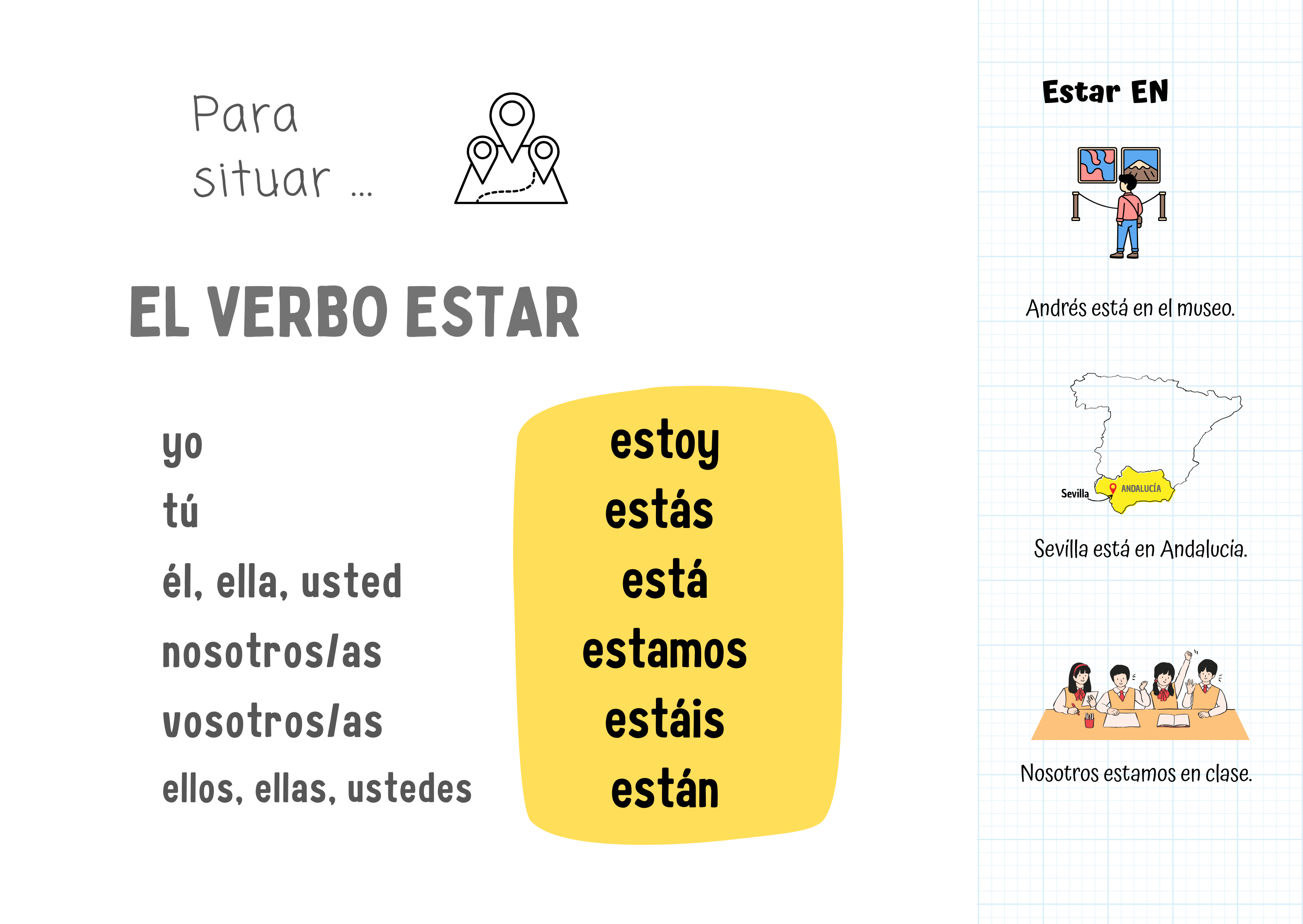 Ici nous allons revoir le verbe ESTAR. Comme vous le savez, ce verbe est employé pour situer dans l’espace.